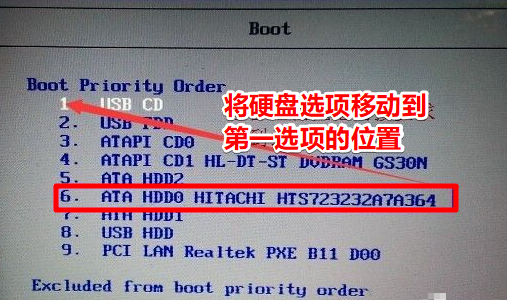 4.在引导界面中,您可以设置系统启动项目。我们选择“硬盘选项”并通过+或-键将其移动到第一个启动项的位置。