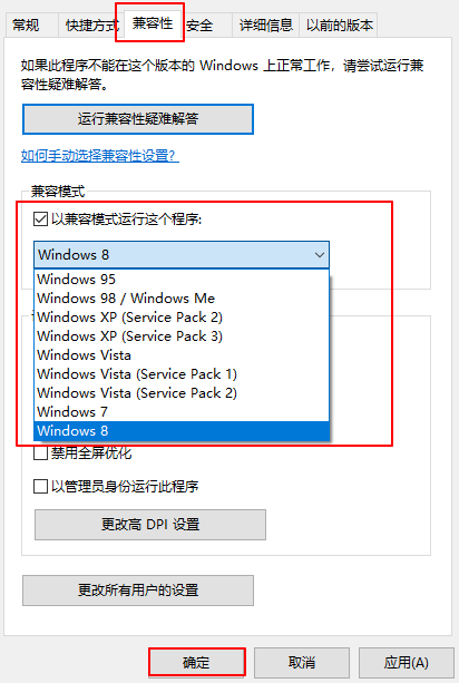 2.切换到“兼容性”选项卡,检查兼容模式,尝试选择win7或win8兼容,看是否能解决问题。