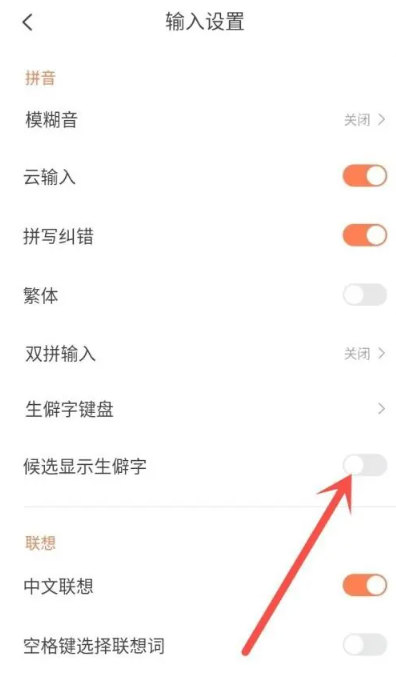4、最后滑动输入设置功能,滑动【候选显示生僻字】按钮将其关闭。
