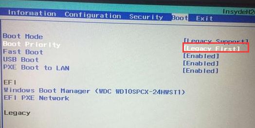 5、将Boot Priority设置为Legacy First,在弹出的窗口中按F10,选择yes并回车,如图:
