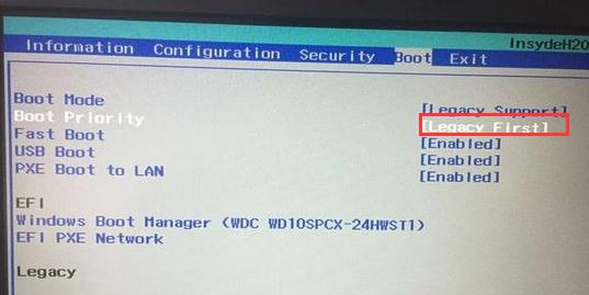 5、将Boot Priority设置为Legacy First,在弹出的窗口中按F10,选择yes并回车,如图所示: