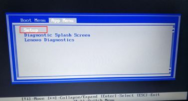 联想ThinkPad P50安装win7系统步骤二:1. 重新启动笔记本并按F12,按TAB键切换栏至“App Menu”,然后选择“setup”进入BIOS设置,或在看到Lenovo或ThinkPad徽标后多次按Enter键听到警报声。然后等待下一个屏幕,然后按F1或Fn+F1进入BIOS主界面。如下图所示;