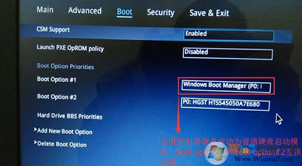 3、继续将boot option#1选项改为正常启动,交换boot option#1和boot option#2的硬盘启动位置,将第一个启动项设置为正常硬盘启动,并使用Windwos Boot Manager启动到UEFI 启动分区。如图所示: