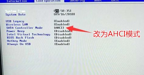 6、注意:返回配置项,勾选SATA控制器模式项。如果默认硬盘模式为RAID,请将硬盘模式更改为AHCI模式,否则进入PE后将无法识别硬盘。如果你改变了,记得按F10保存。如下图所示;