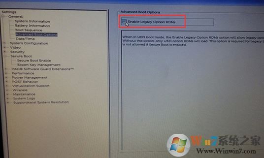 2、切换到Advanced Boot Options,勾选右侧的Enable Legacy option roms选项,如下图;