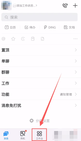 1、首先打开钉钉APP,点击主页面底部的【工作台】进入专区;