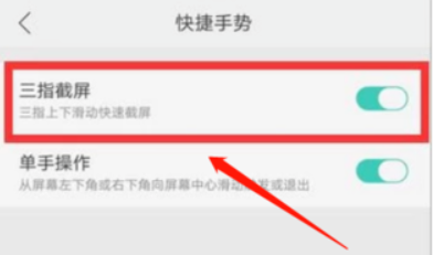 2、然后点击下方页面的快捷手势,滑动【三指截图】后面的按钮进行设置;