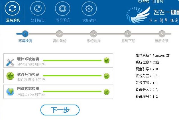2、这时软件会先进行环境检测,确定电脑是否可以进行系统重装,检测完毕后【点击下一步】;