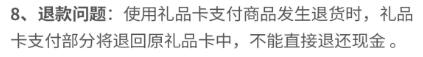 1. 退款时,退款金额将退回到礼品卡中,不会退回到余额中。