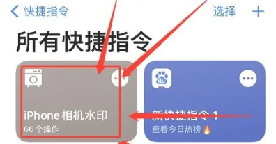 1、首先打开苹果手机中的快捷命令,选择左下角的【iPhone相机水印】图标;