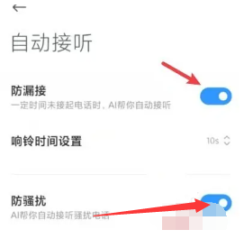 3. 在最后一个自动接听功能页面,滑动【防漏接】后面的按钮将其关闭。