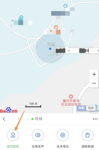 8、最后跳转到地图页面,点击左侧【定位成功】,选择【声音】即可找到设备。
