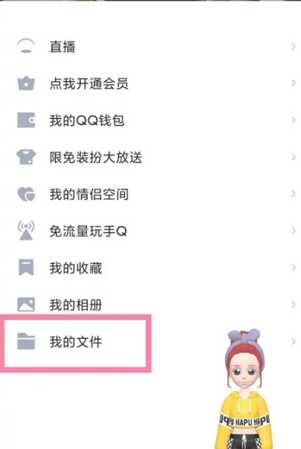 1、首先打开QQ应用,点击主页面左上角【头像】,选择左侧菜单栏【我的文件】;