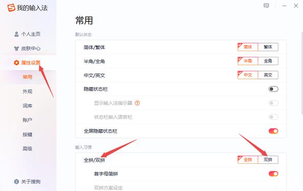 2.在属性设置中找到输入习惯,然后将全拼改为双拼。