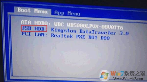 5、选择以USB或U盘开头的名称,启动U盘,然后进入U盘Pe系统;