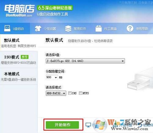 2、插入U盘,点击【开始制作】; (U盘会被格式化,建议使用空盘或者备份重要数据),如图: