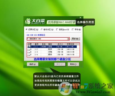 3、进入PE后,运行【大白菜一键安装工具】,然后选择你要安装的系统GHO,然后选择你要安装的分区,大部分是C盘,如图;