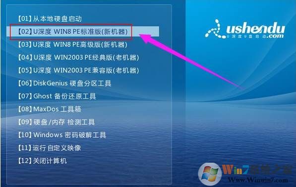 2、首先将U盘连接到电脑,重新启动电脑,等待出现启动画面。按启动快捷键(一般为F12、F11、F9、ESC等快捷键),使用U Deepin启动盘进入U Deepin主菜单。选择【02】U深度Win8PE标准版(新机新版本也有Win10PE),按回车键进入。