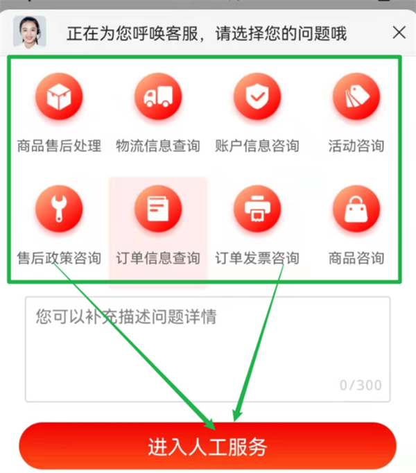 4. 选择您想了解的问题,然后点击【进入人工服务】。