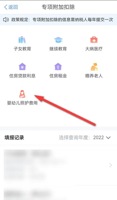 2、然后进入专项附加扣除页面,找到【婴幼儿看护费用】;