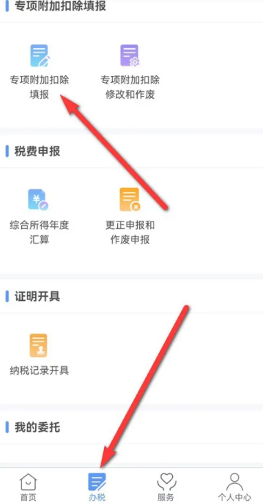 1.首先打开个人所得税APP,进入主页面,选择【税务处理】,找到【填写专项附加扣除】;