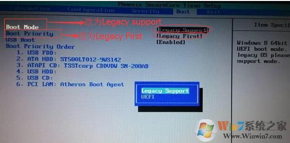 2、进入bios界面后,我们将选项移至boot,然后将启动模式uefi对应的设置更改为legacy support,并将启动优先级更改为先legacy,如图: