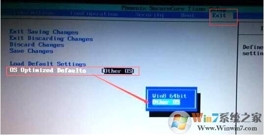 3.然后更改BIOS默认系统。退出选项下,出厂时默认机器是win8 64bit。我们需要将其更改为Other OS,如图: