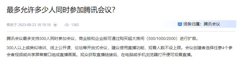 腾讯会议(商务版):根据购买容量,最多可容纳2000人参加会议。商务版有300人、500人、1000人、2000人的会议室规格。
