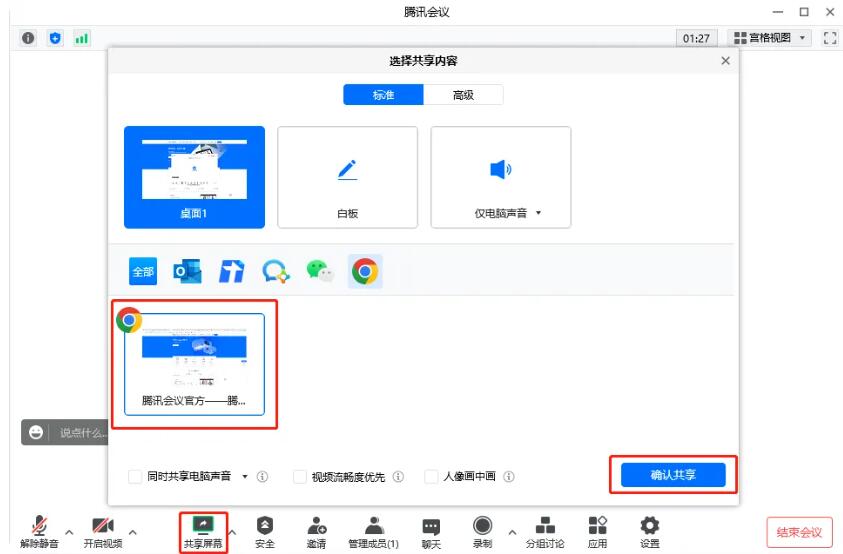 1. 首先,单击工具栏中的共享屏幕,然后单击确认共享。