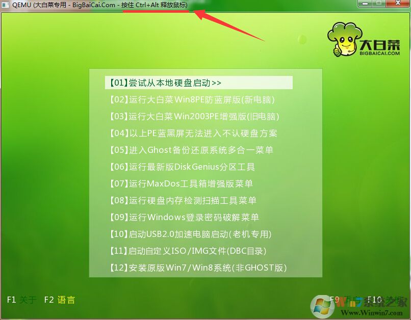 6、如果电脑模拟能够成功启动,则说明大白菜U盘启动盘制作成功。按Ctrl+Alt并释放鼠标关闭窗口即可完成操作。如下图