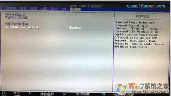 在一些预装了Win8/8.1的电脑上,会有一个OS Optimized Defaults选项。未预装Win8/8.1的电脑没有此设置选项。操作系统优化默认值是一个“顶级”设置选项。当该选项打开时,BIOS会自动将所有相关选项(即下面要介绍的各个选项)恢复为预装Win8/8.1默认启动方式所需的标准设置。具体设置: