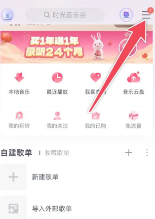 1、首先打开咪咕音乐APP进入主页面,点击右上角的【三横线】;