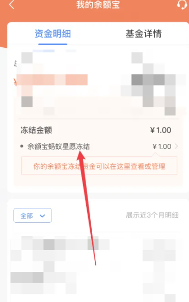 2、然后在余额宝功能页面,点击【冻结金额】,如下图箭头所示;