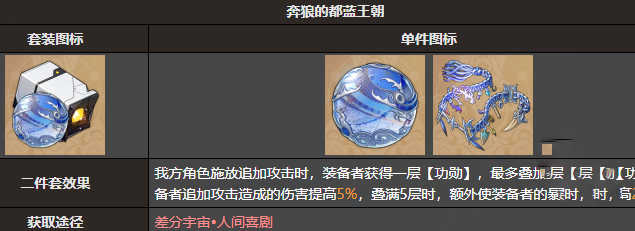 奔狼的都蓝王朝两件套1.两件套给角色带来的是,额外的攻击会给飞笑带来一层功德,这个功德可以叠加五次。