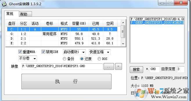 3、参考下图设置方法,勾选后点击【执行】;选择GHO文件,选择C盘,活动分区A
