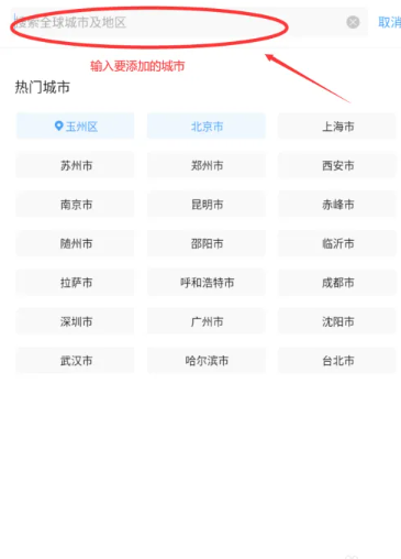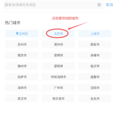 3、然后跳转到输入城市界面,点击右侧【+添加城市】按钮;