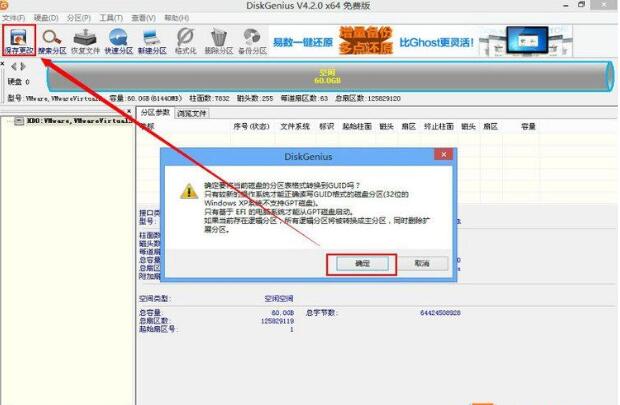 4、打开Diskgenius分区工具,将硬盘更改为GPT分区模式。如果您当前的硬盘已经有数据并且您不想影响数据,请下载DiskGenius专业版并运行64位专业版。由于PE中的DiskGenius是免费版本,因此不支持在不丢失数据的情况下将MBR转换为GPT或GPT转换为MBR。这里的实验环境是空硬盘,所以直接创建GPT分区。如下图: