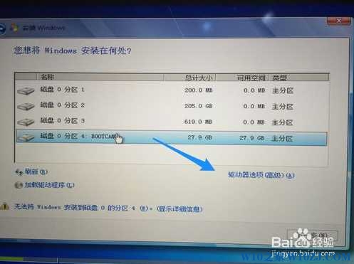 8、接下来在安装系统分区界面,选择bootcamp分区,点击“驱动器高级”选项,如图