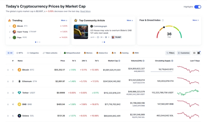 2. CoinMarketCapCoinMarketCap作为数字货币领域权威市值排名网站,以其简洁清晰的用户界面和全面详细的市场数据而闻名。网站提供实时更新的数字货币价格、市值、交易量等信息,帮助用户快速掌握市场脉搏。同时,CoinMarketCap还提供市值排名、交易量、流通量等多个维度的数据分析,为用户全面了解市场行情提供有力支撑。对于新币炒家来说,CoinMarketCap无疑是获取市场基础信息、进行初步分析的得力助手。