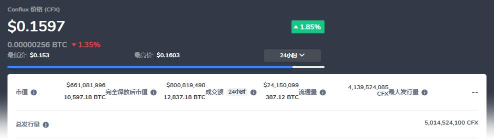 截至目前,CFX币价格为0.1596美元,24小时内最低价为0.153美元,最高价为0.1603美元,交易量为800819498美元,流通量已达24150099美元。
