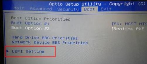 2.进入Boot界面,选择UEFI Setting并回车;