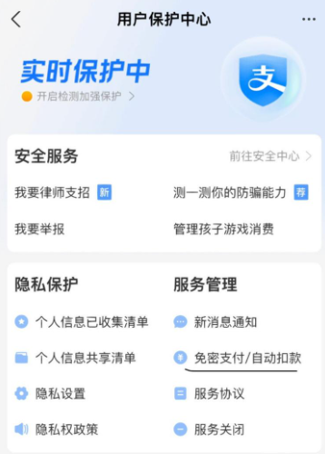 6、然后在用户保护中心选择【免密支付/自动扣费】;