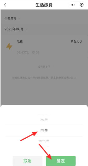 5.最后,底部会弹出查询类型。找到电费单,点击【确定】即可得到详细的查询结果。