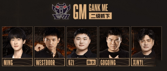 GM:上单gogoing、打野xinyi、中单西门、下单uzi、辅助ming