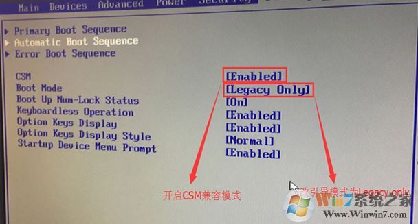 3、切换到Boot,将Boot Mode从UEFI改为Legacy only boot模式,然后将csm默认disabled改为enabled,开启兼容模式,选择F10保存设置,在弹出的选项中选择YES;
