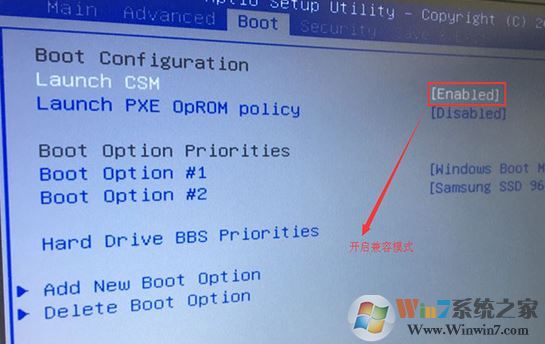 2、重启后切换到BOOT选项,将Launch CSM从disabled改为enabled,并启用兼容模式;