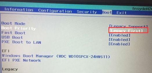 5、将Boot Priority设置为Legacy First,在弹出的窗口中按F10,选择yes并回车;