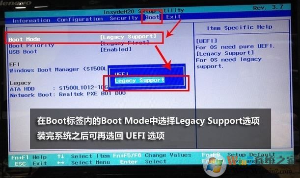 2、然后在BOOT页面将Boot Mode改为Legacy Support;