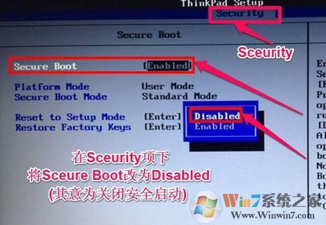 1、按方向键移至Security,将secure boot改为disabled,关闭secure boot,如下图;