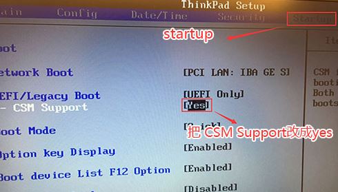 2. 选择启动并将csm support 设置为Yes(打开兼容模式)。